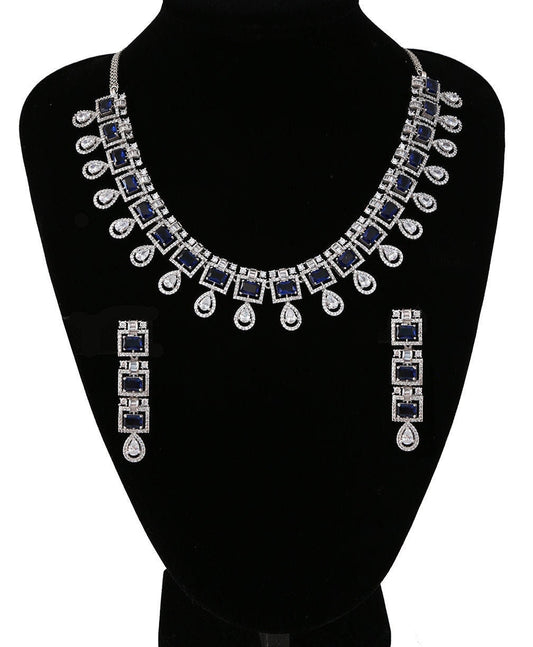 Simple Light Weight CZ and Blue Sapphire American Diamond Flower Pendant Short Necklace|Indian gold plated jewellery|Indian wedding earrings