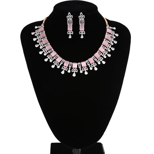 Rose gold american diamond necklace set | pink cz diamond necklace set | emerald cut crystal necklace | indian bollywood jewelry necklace