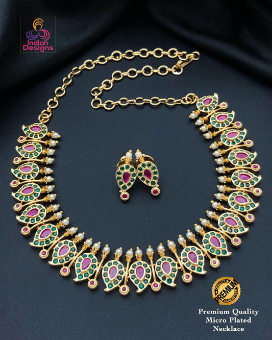 American diamond ruby green necklace set| matte finish cz jewelry with pearl