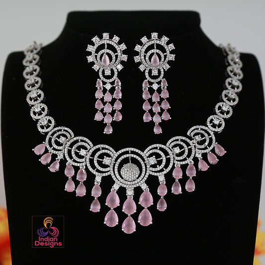 Elegant CZ Necklace Set -Pink, Mint Green, Purple- Indian Style Choker Jewelry| Party wear Short necklace| Antique victorian finish neck set
