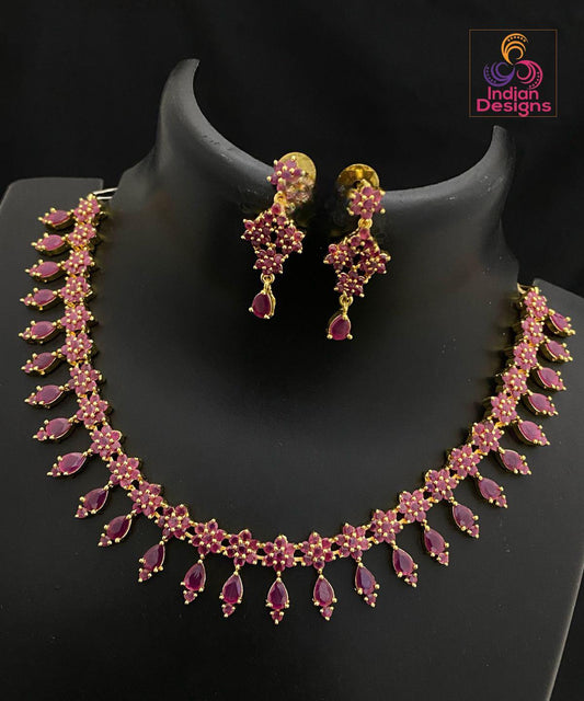CZ Stone Ruby Necklace Set with Earrings| Gold Plated American Diamond Wedding Jewelry| Indian Wedding Jewelry| Festive Necklace Gift Set