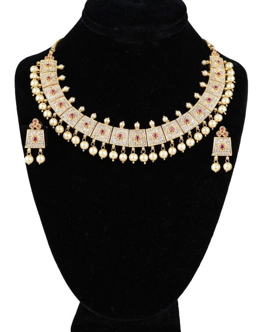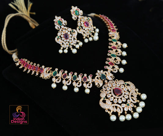 Stunning American Diamond CZ Bridal Necklace Set With Rubies and Pearls