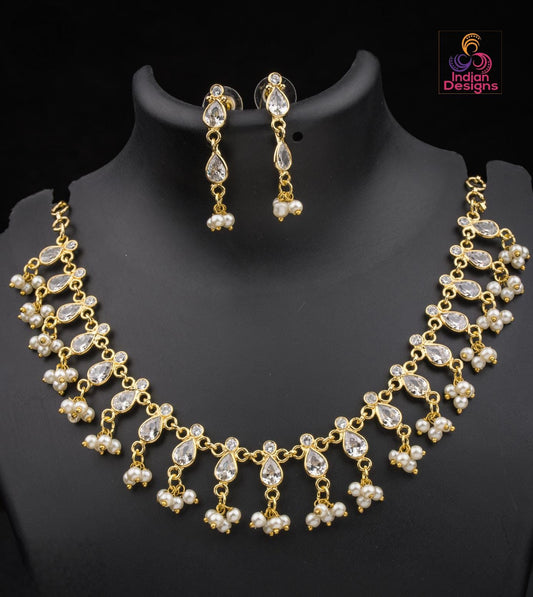 Gold-Plated American Diamond Choker Necklace Set with Pearls & CZ Stones| Elegant Wedding Party Jewelry| Indian jewelry| Gift for her