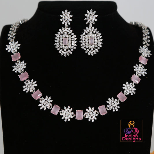 Silver Plated American Diamond Necklace & Earrings| Simple Necklace set with CZ Ad stones| Minimalist Wedding necklace| Statement necklace