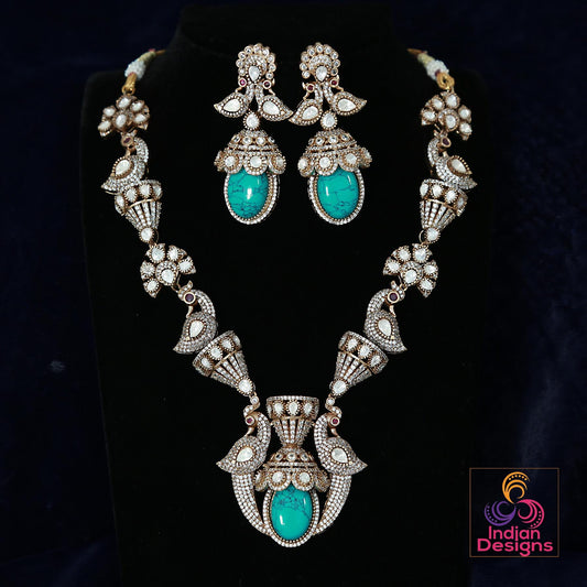 Gold Plated Ruby and Green American diamond necklace Earring set| Indian Designs Jewelry| Luxury bridal set| Tear drop Necklace|Gift for her