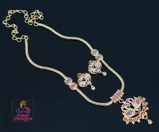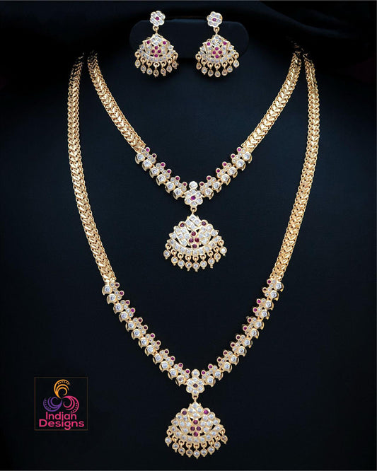 Gold-Plated Attigai Necklace & Earrings with CZ Stones| AD stone Long-short necklace combo| South Indian style Wedding Jewelry| gift for her