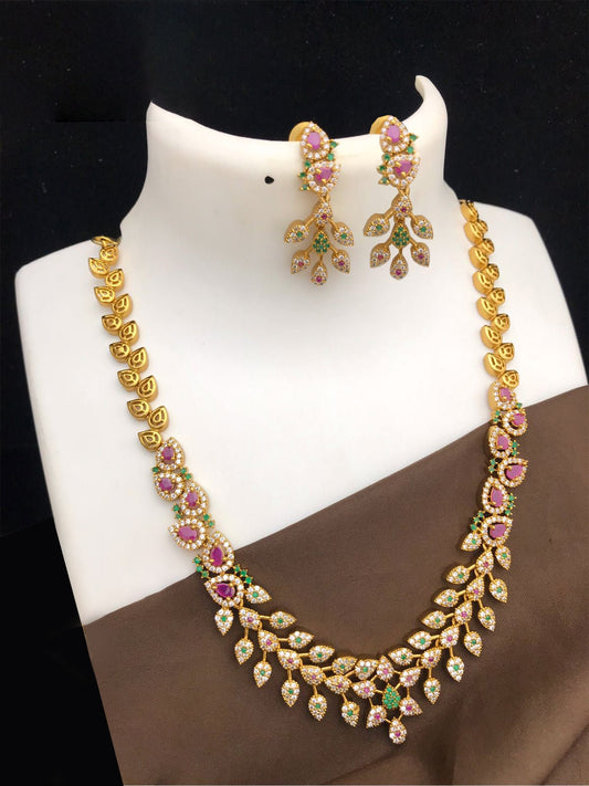 Gold Plated Minimalist CZ necklace set with earrings| Simple Stylish Necklace And Earrings| Ruby and green Indian jewelry|South Indian style