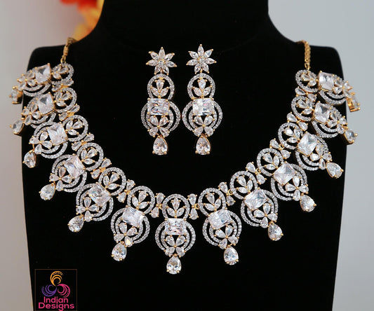 Gold-Plated CZ American Diamond Necklace Set| Statement Necklace for Weddings| Bridal Party-wear Jewelry| Indian jewelry | Gift for her