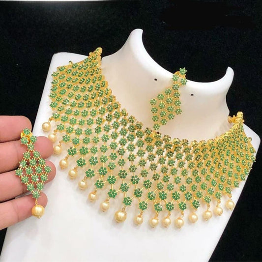 Gold Plated Indian Jewelry necklace Matte finish| Floral & Leaf Design AD Necklace| American Diamond Jewelry set| Ruby Green CZ necklace set