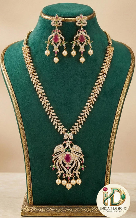 Stunning American Diamond CZ Bridal Necklace Set With Rubies and Pearls