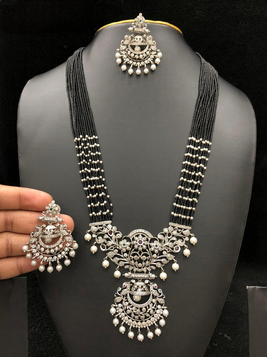 Multi-strand silver pendant necklace set with matching earrings - available in green, red, and black beads| statement silver necklace