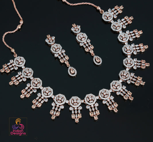 Rose Gold American Diamond Necklace set with Ruby Accents|CZ Diamond Bridal Necklace|Indian, Pakistani,Punjabi wedding jewelry|Gift for her