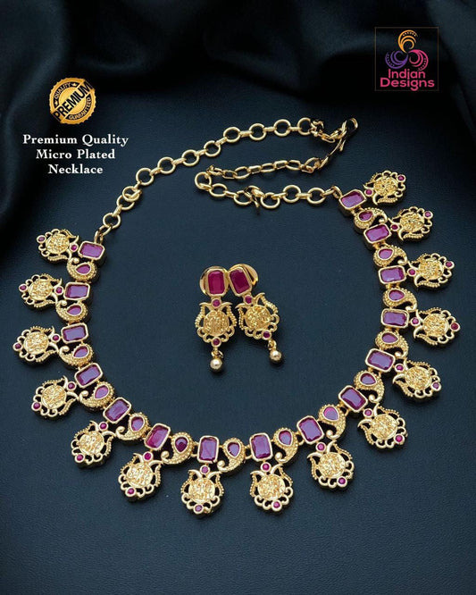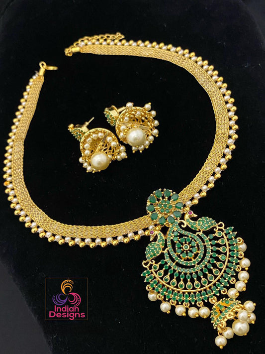 Gold Plated American Diamond Dainty Necklace and Earrings| Emerald Ruby CZ Diamond choker| Indian jewelry| Statement Necklace| Gift for her