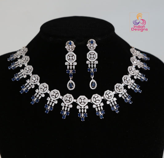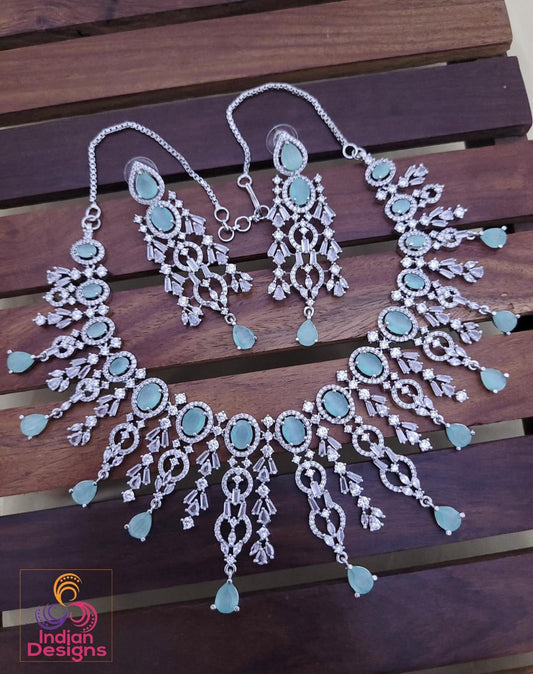 American diamond blue sapphire/emerald green/topaz necklace &earring set| silver tone indian/pakistani/punjabi wedding jewelry| gift for her
