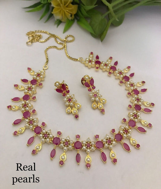Gold-Plated American Diamond Necklace and Earrings Set with Ruby Accents and Pearls| CZ Diamond Topaz/Blue Sapphire Necklace| Gift for her