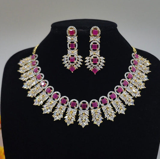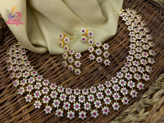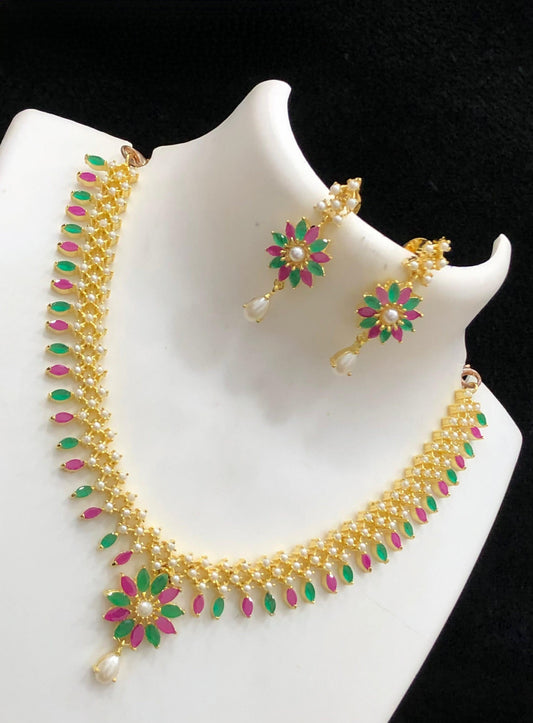 American Diamond necklace Earrings |Gold Plated emerald necklace Floral pattern |Beautiful Ruby necklace Floral design |Clear stone necklace