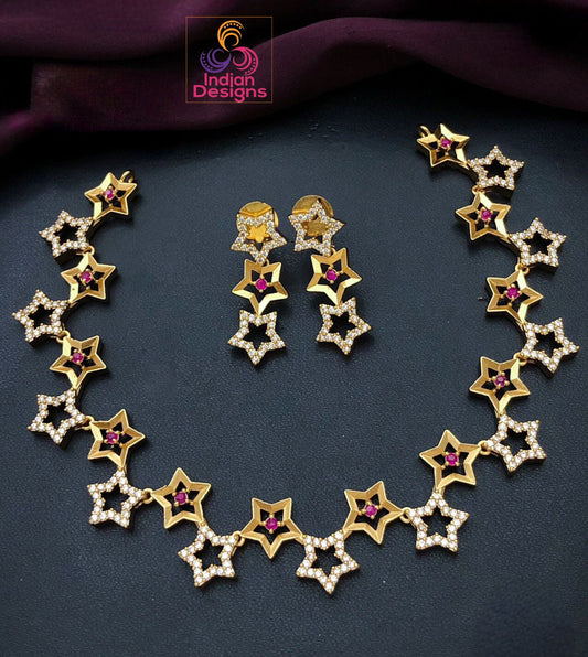 Ruby-Encrusted Matte Gold Star Choker Necklace with Earrings Set | Matte Finish Simple Choker Set | Gift for her