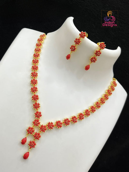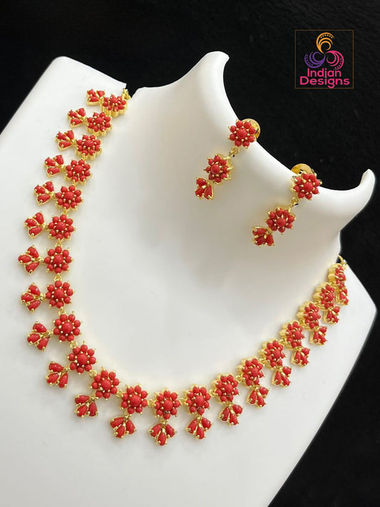 Red Coral Gold Plated American Diamond Choker necklace Earrings and Floral Pendant set, Real Pearl and Crystal choker, South Indian Jewelry