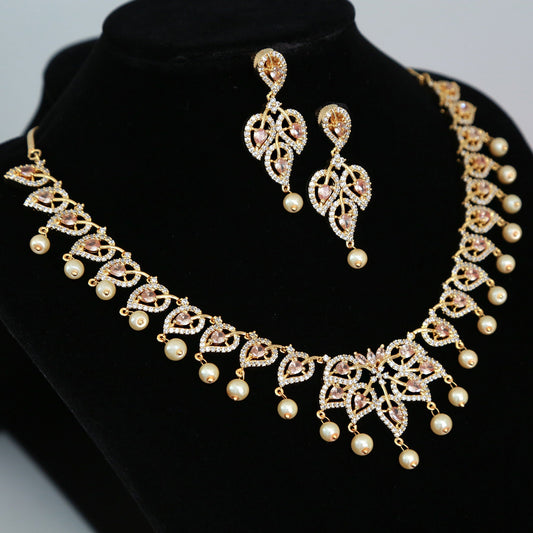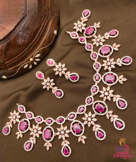 American Diamond Rose Gold Necklace Earrings Wedding Necklace set | Pink Cz Stone Indian Jewelry |Statement Necklace |Indian Designs Jewelry
