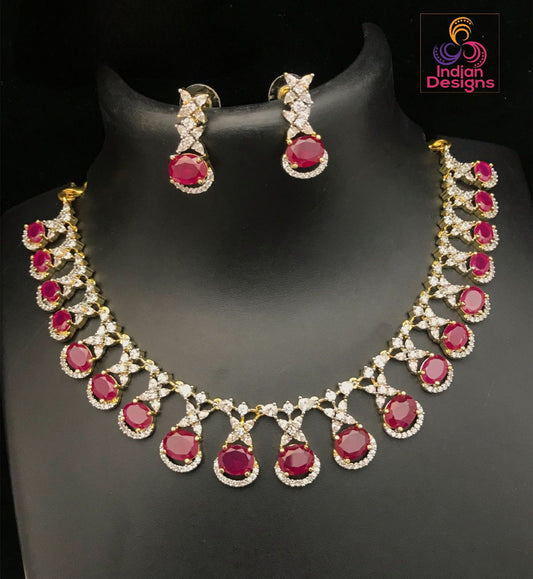 American Diamond Silver Plated Ruby and Crystal Necklace Set Bridal Statement Jewelry| Wedding choker necklace with Earrings| Gift For her