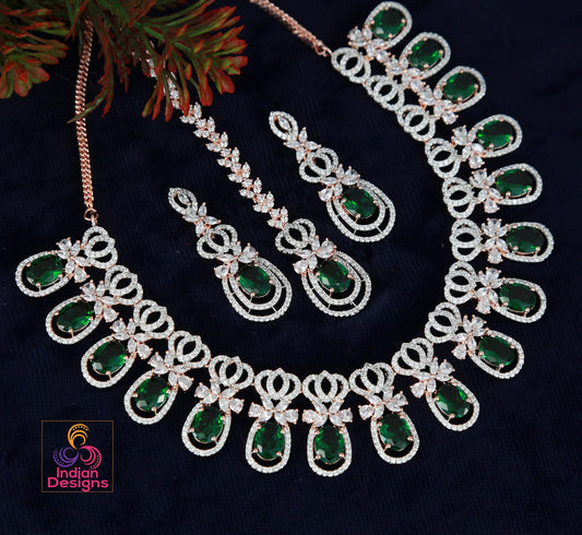 Rose Gold American Diamond Indian Jewelry Set with Mint Teardrop Earrings for Bridal & Partywear|Statement Necklace|Bollywood style jewelry