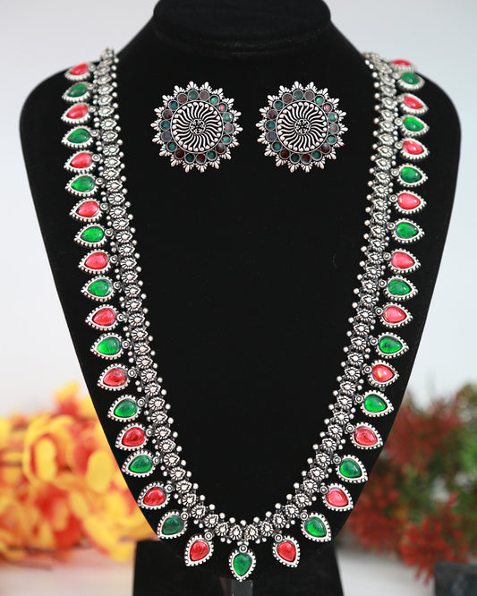 Oxidized long Necklace set | German Silver Indian Oxidized Necklace and Earrings Set in Turquoise, Emerald, and Ruby Tones | Boho Jewelry