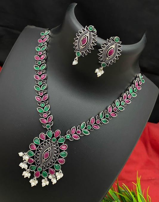Oxidized German Silver Indian jewelry necklace|Bohemian Set with Ruby & Emerald |Wedding Jewelry |Party Wear Jewelry Set|Unique Gift for Her
