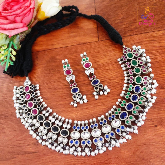 Traditional Indian Silver Oxidized Choker Necklace with Multicolor Gemstones & Matching Earrings Set| German Silver jewelry | Gift for her