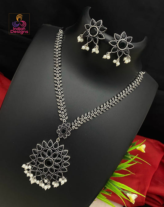 Oxidized Silver Necklace Pendant, German Silver Floral Designs Pendant Earrings for women