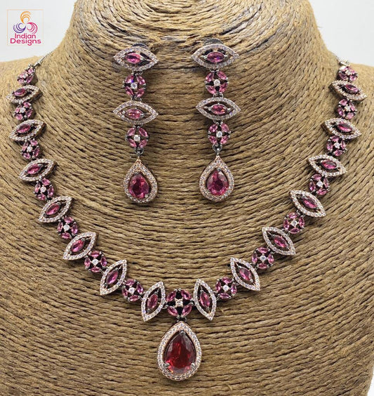 American Diamond Mint Green - Black and Rose gold plated Oxidized Necklace | AD wedding jewelry set Indian | CZ wedding choker jewelry Pink