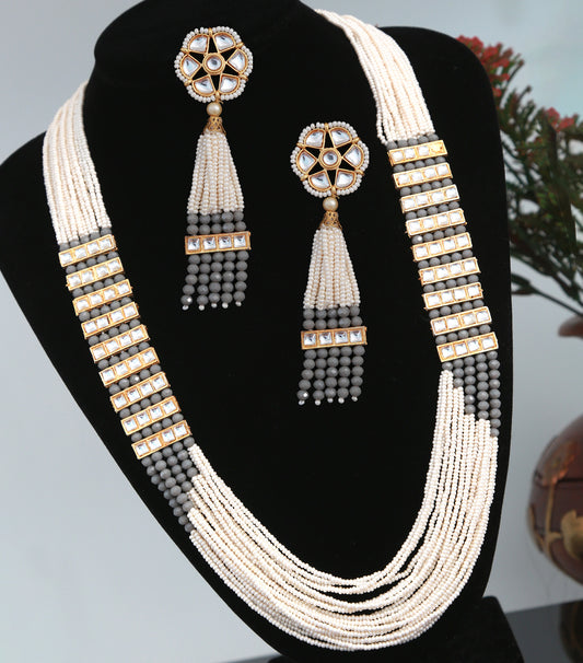 Gold Plated Multi-strand long Pearl and hydro beads set with Kundan stones and Floral Earrings