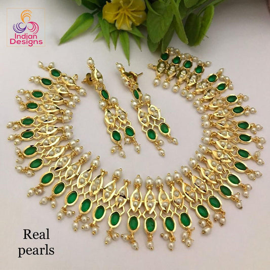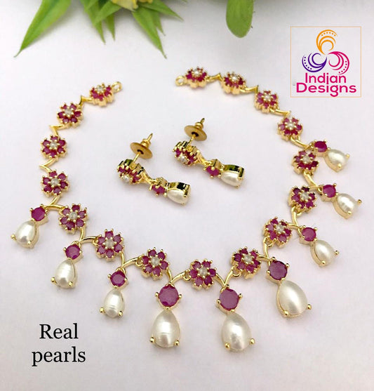 Gold Plated Real Pearl Ruby & Emerald necklace | American diamond Crystal floral necklace with pearl drop choker for wedding