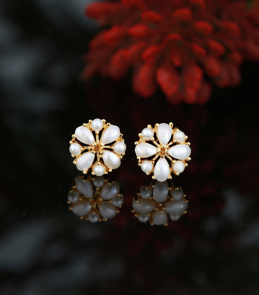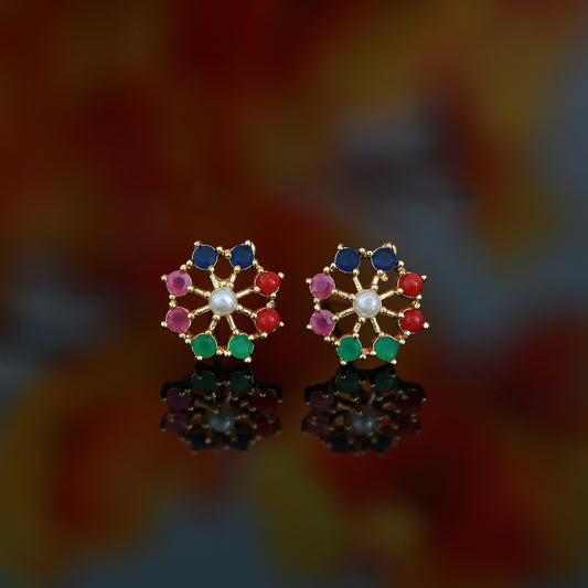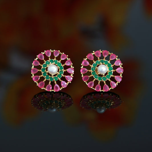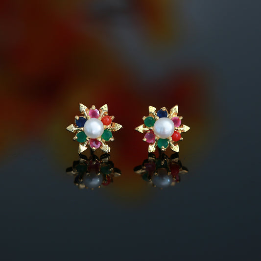 Multi-Color small CZ Stone Pearl Stud Earrings 22K Gold Plated | American diamond Floral Pearl stud Earrings tops |Trendy Stud earrings