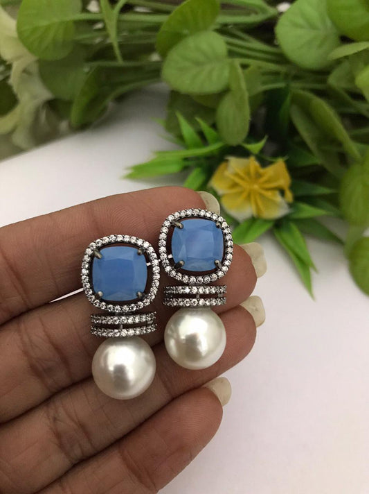 Fresh water Pearl Silver stud Earrings with sky blue American Diamond Cz stone