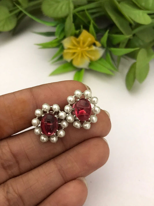 Rhodium Tone Silver Finish Oval shape gorgeous Pink Quartz Stud Earrings | Light Stud Earrings | Pink stone Wedding Pearl Earrings