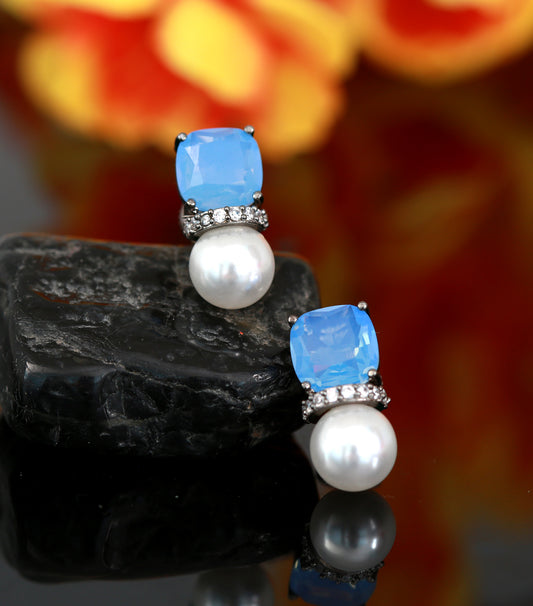 Exclusive Blue CZ stone Pearl Stud Earrings | Silver tops
