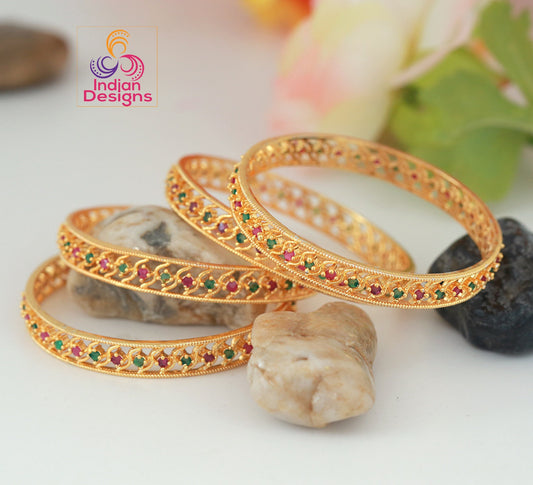 4pcs One gram gold Bridal bangle Set | American diamond Ruby emerald stone gold bangles Indian Designs | South Indian style wedding bangles