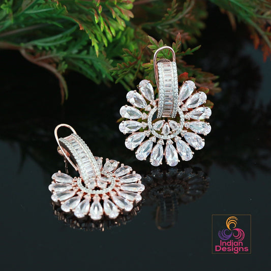 Rose Gold flower stud Crystal earrings | Big Ad stud CZ stones earrings | Plated American Diamond stud Earrings | Bollywood style CZ Studs