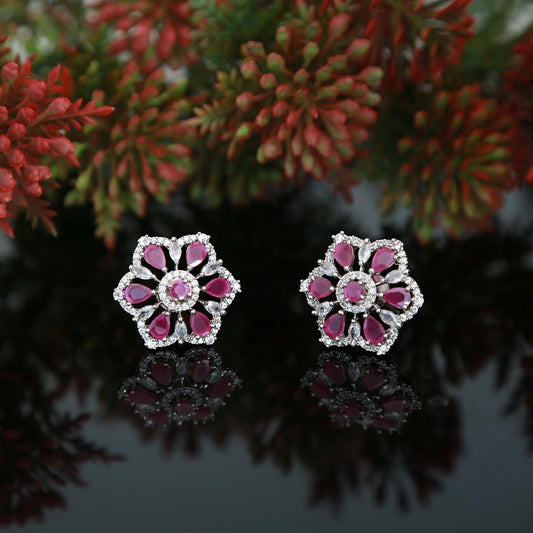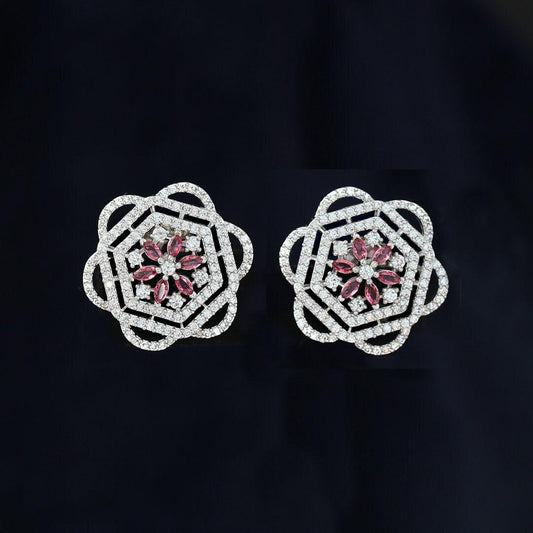 Big size cz silver plated american diamond flower shape stud earrings | color stone stud earrings | rhodium plated silver tops |gift for her