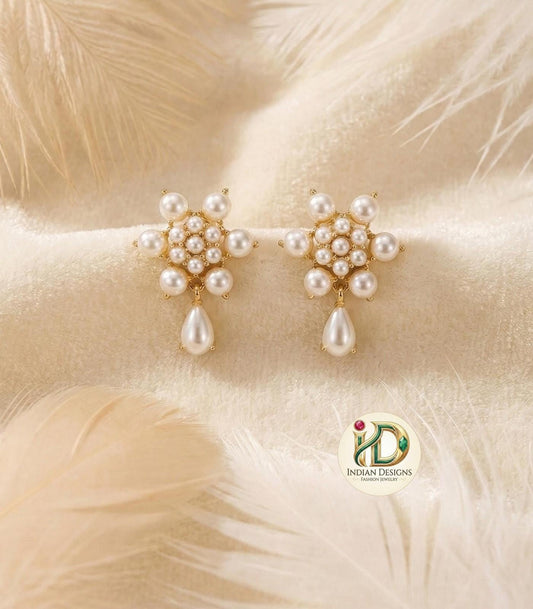 Gold plated pearl stud earrings| floral pearl drop tops| classic white flower