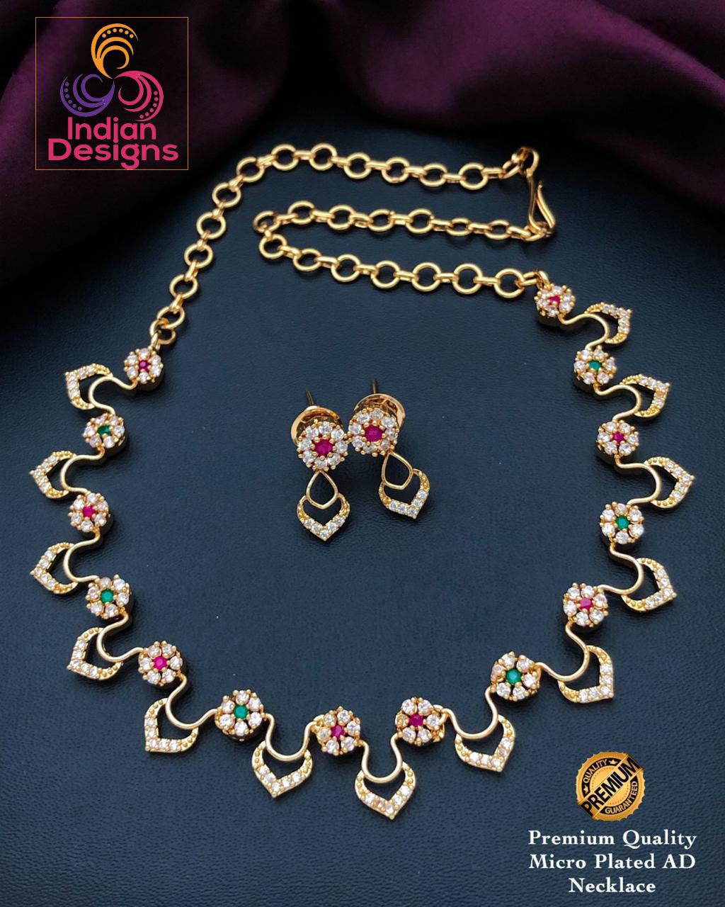 Gold Plated American diamond necklace set with earrings| Floral Design CZ Choker necklace| Minimalist Necklace Jewelry| South Indian style