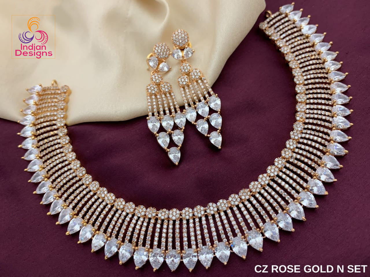 Pear shaped Clear white CZ american Diamond stone studded necklace with high quality Rose gold plating.