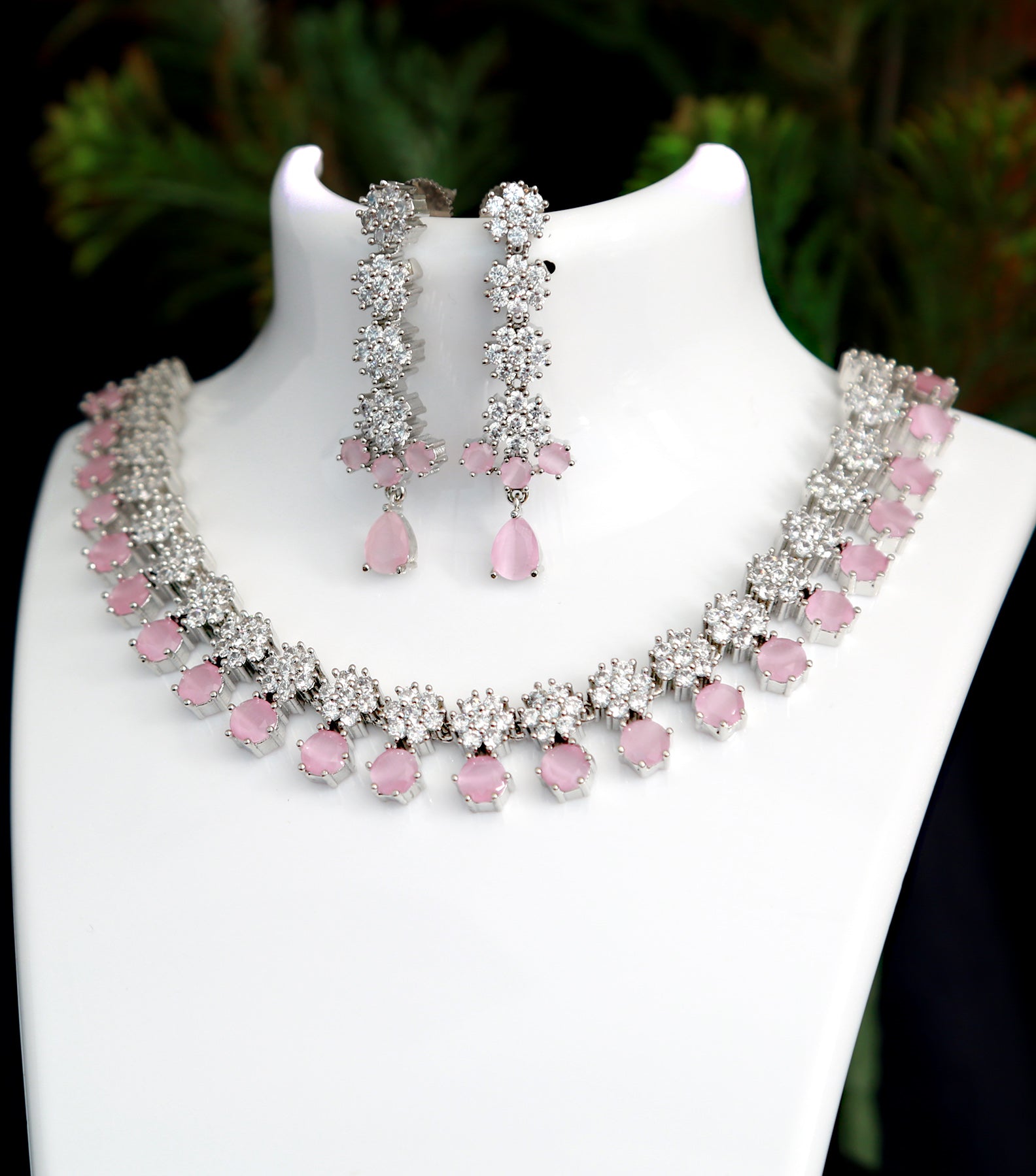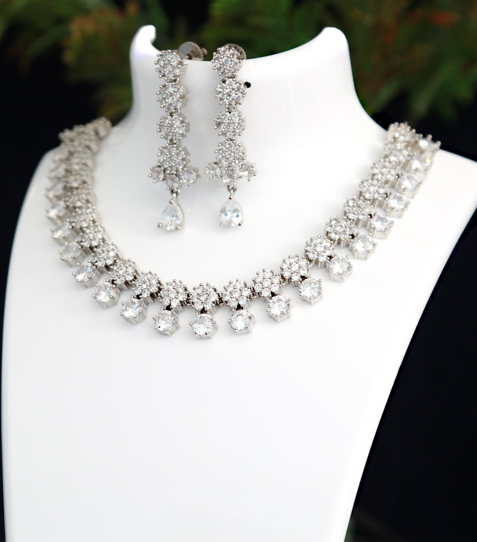 The exclusive silver American diamond necklace is a stunning piece of jewelry that features with high-quality American diamonds. The necklace is crafted with intricate detailing and is plated with silver to give it a luxurious and elegant finish.