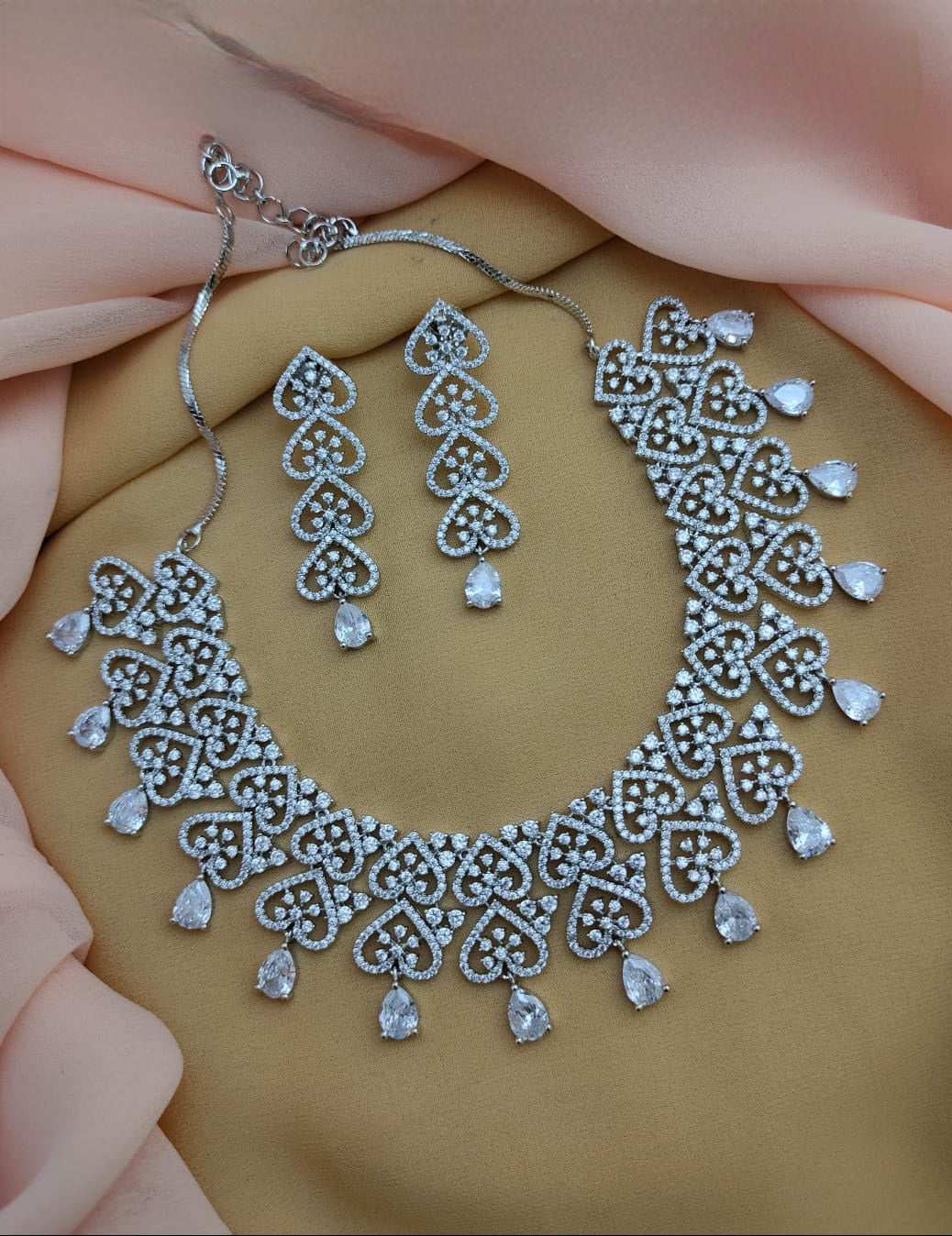 This exquisite silver necklace set features American Diamonds and faux Blue Sapphire with CZ Diamonds, creating the ideal combination of sparkle and elegance. Perfect for any Indian or Pakistani wedding celebration, this necklace offers a timeless addition to your jewelry collection.