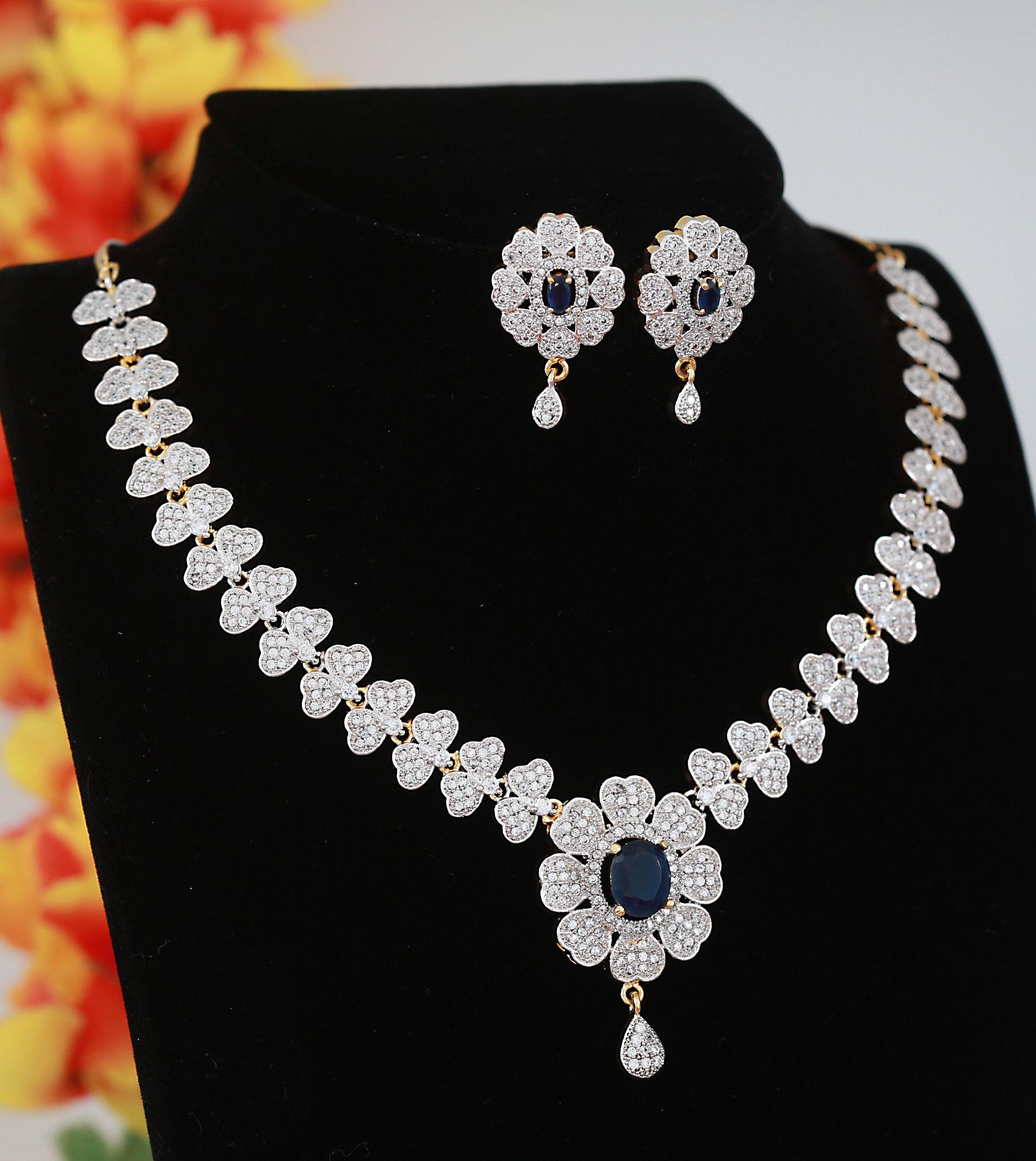 Design Highlights: Floral design with white American diamond CZ stones Navy blue stone centerpiece adds a regal touch Matching drop earrings with CZ detailing Lightweight, high-quality finish for all-day wear Ideal for weddings, receptions, Haldi, Diwali, or special events š A perfect gift for brides, bridesmaids, or loved ones!